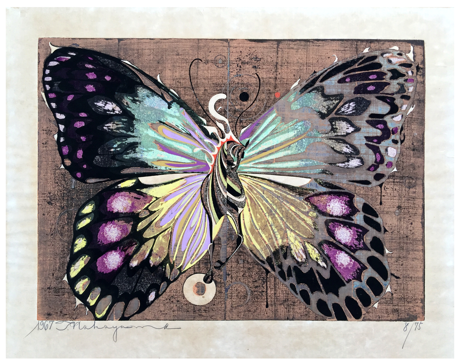 Notes: Beautiful and colorful print from Tadashi Nakayama, featuring a butterfly with a body of a horse. Hand signed and numbered 8 out 75