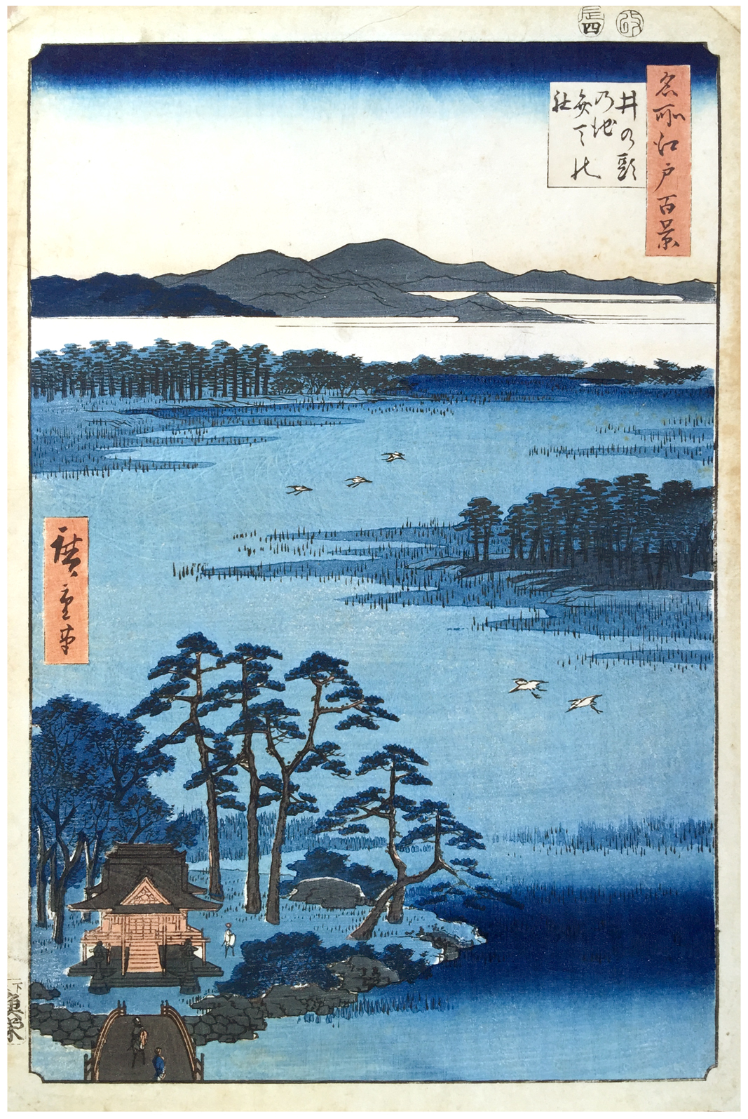 The orientation of the geography here suggests a blending of two different points of view. The pond itself is represented as seen from the northwest, while both the mountains in the distance and the shrine to the goddess Benten in the foreground are shown as seen from the south. In the case of the shrine, the southern perspective enables a frontal view that emphasizes the shrine's importance.