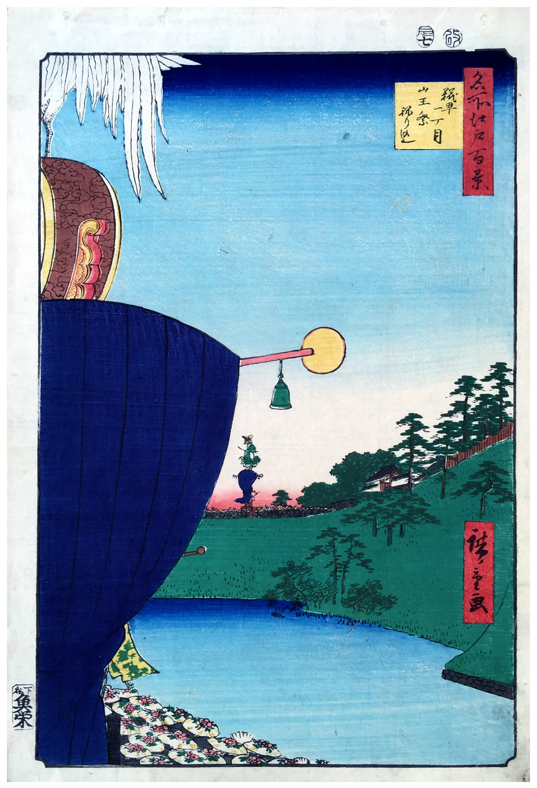 The entire procession, which occurred between the tenth and sixteenth days of the sixth month, consisted of more than fifty large and lavishly decorated floats, of which Hiroshige provides only a hint. The two floats here come from two of the city's oldest commoner districts.