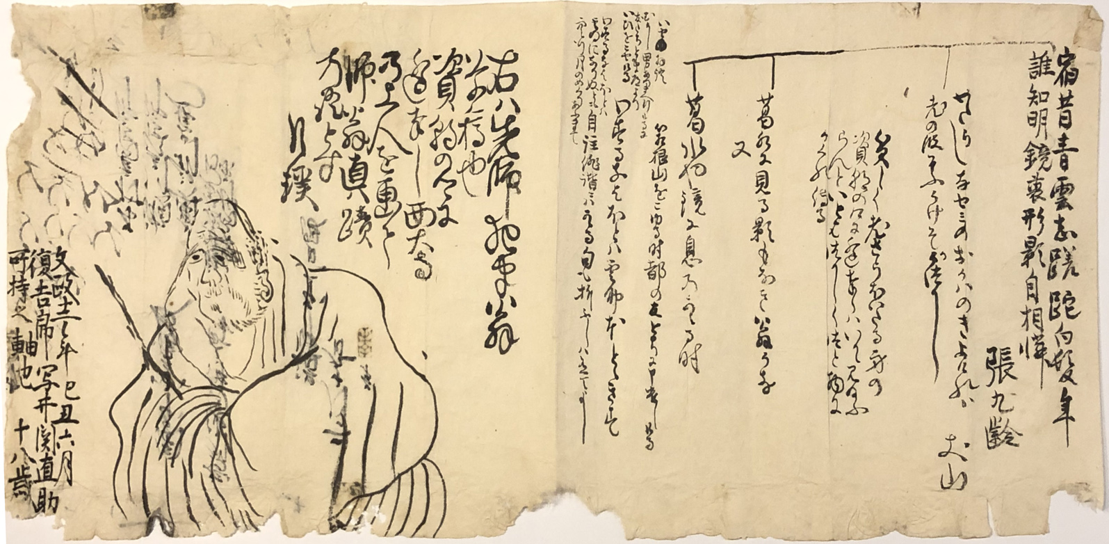 The inscriptions on the sheet of paper are occasional poems and haiku citations by members of a friendly Japanese company of literati on ageing. The first (right hand side) one is a short poem from the noted Chinese poet Zhang Jiuling (678-740) titled