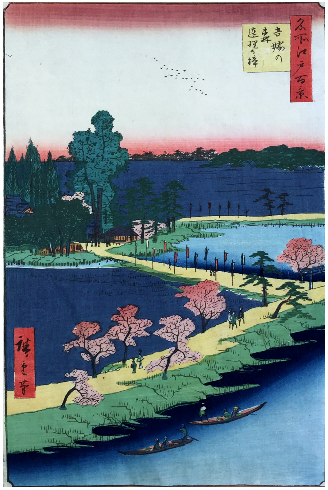 More about this print: It is dusk on a spring day. A flock of birds crosses the dimming northeast sky as two boats pass each other below on the canal. The surface of the path to the Azuma Shrine is bathed in yellow, reflecting the late afternoon sun. Across the small bridge at the entrance to the shrine is the giant split trunk of the sacred tree known as the Entwined Camphor. The tree recalls an ancient legend about the mythical lovers Prince Yamato Takeru and Princess Ototachibana.