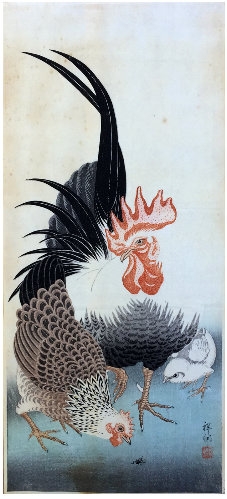 Woodblock Prints Title: Bantan Cock Hen and Chick