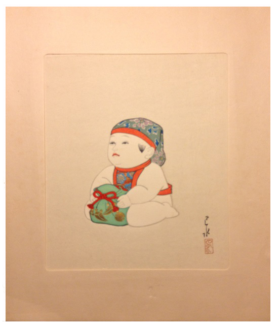 Notes:From the series of 24 designs of doll prints "Gosho Ningyo" which were printed by Kato Junji and published from Meiji Shobo. The original publisher's inventory number is "1". Doll wearing a cap and "kinchaku" bag. Both of them are symbols of the wealth