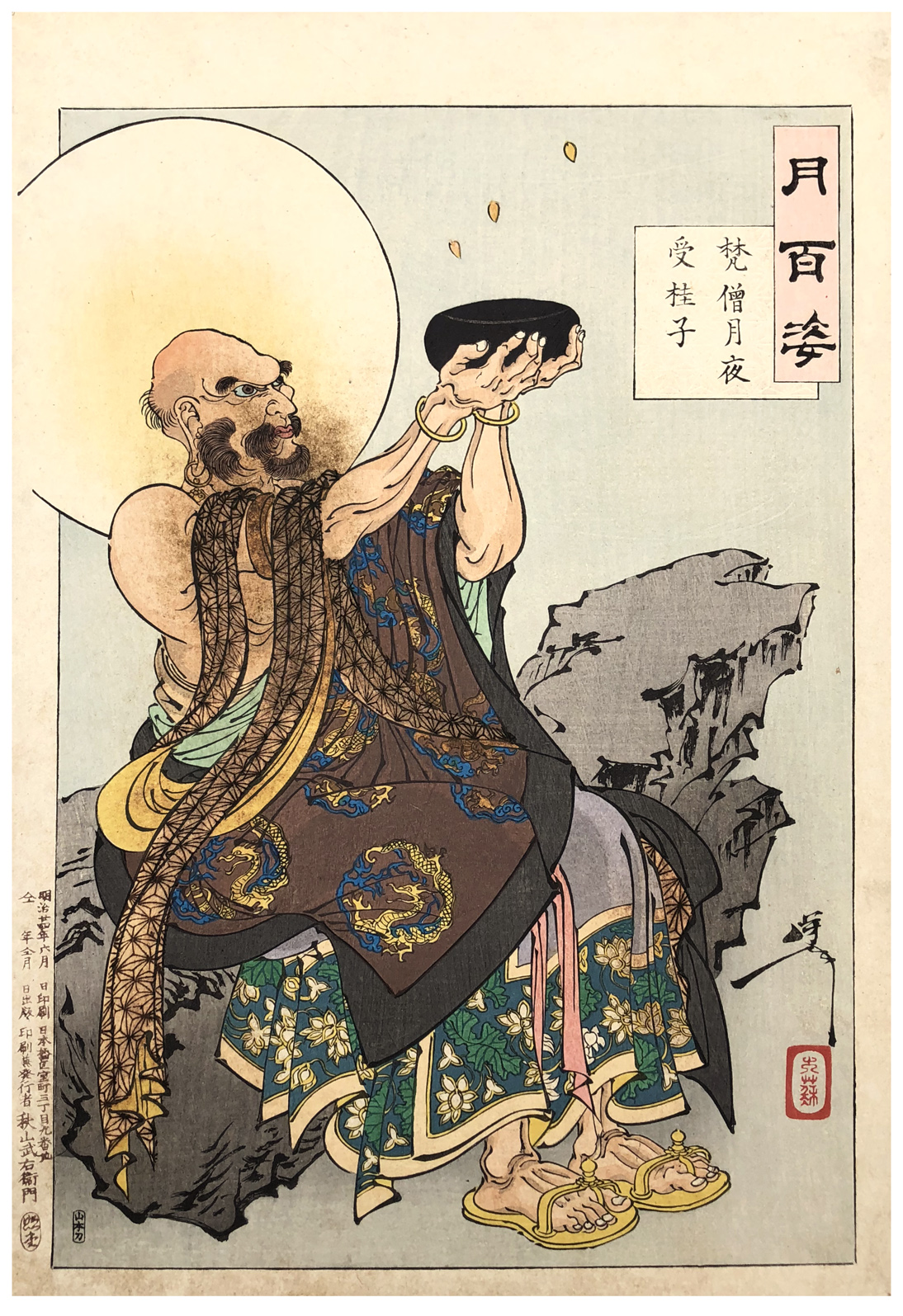 More about this Print: An Arhat, an enlightened Buddist monk, sitting on a rock, catches seeds from the eight cassia trees on the moon. Because of their quality of perpetual renewal, the trees produce seeds that are thought to have magical properties. The halo around the monk's shaven head doubles as moon.