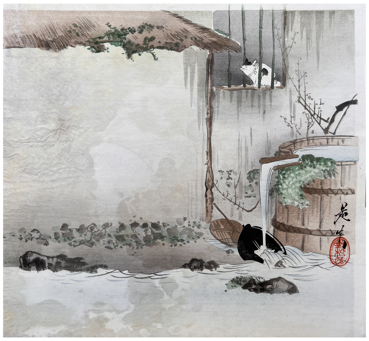 Woodblock Print Title: Cat in a Farmhouse Window