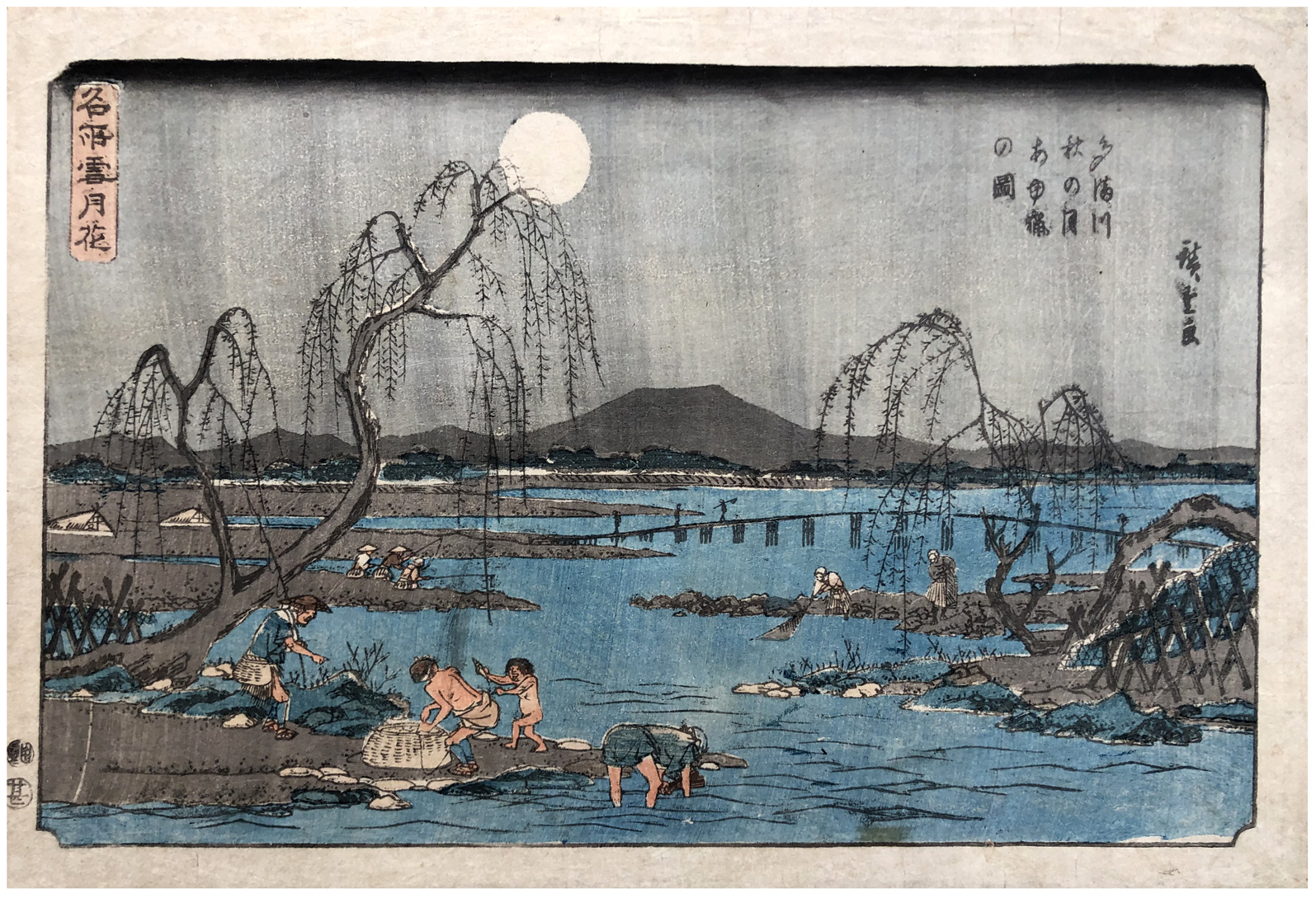 Woodblock Print Title: Catching Sweetfish in the Tama River under the Autumn Moon (Tamagawa aki no tsuki ayugari no zu), from the series Snow, Moon, and Flowers at Famous Places (Meisho setsugekka)