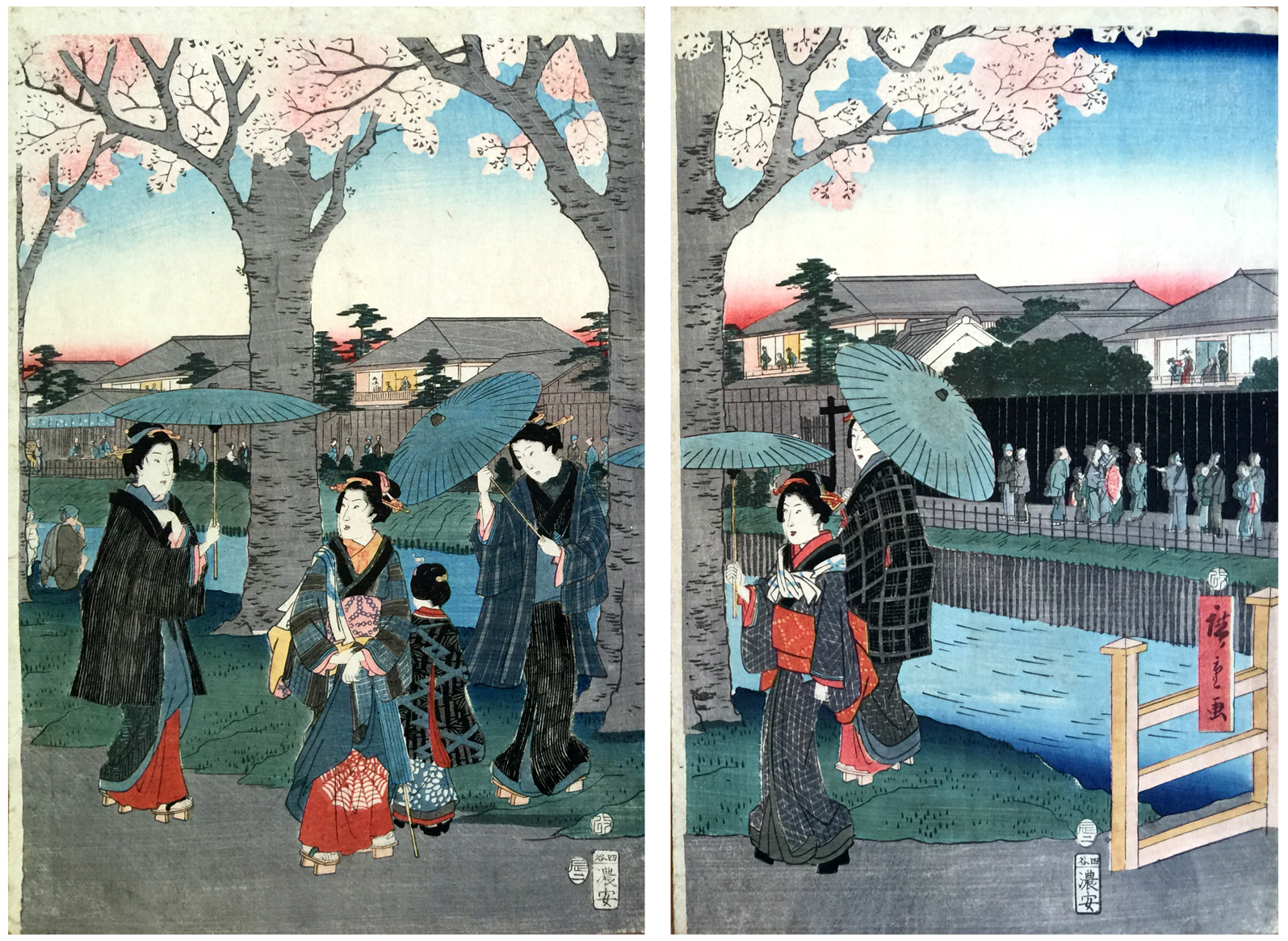 Woodblock Prints Title: Cherry Blossom Promenade by the Tama River