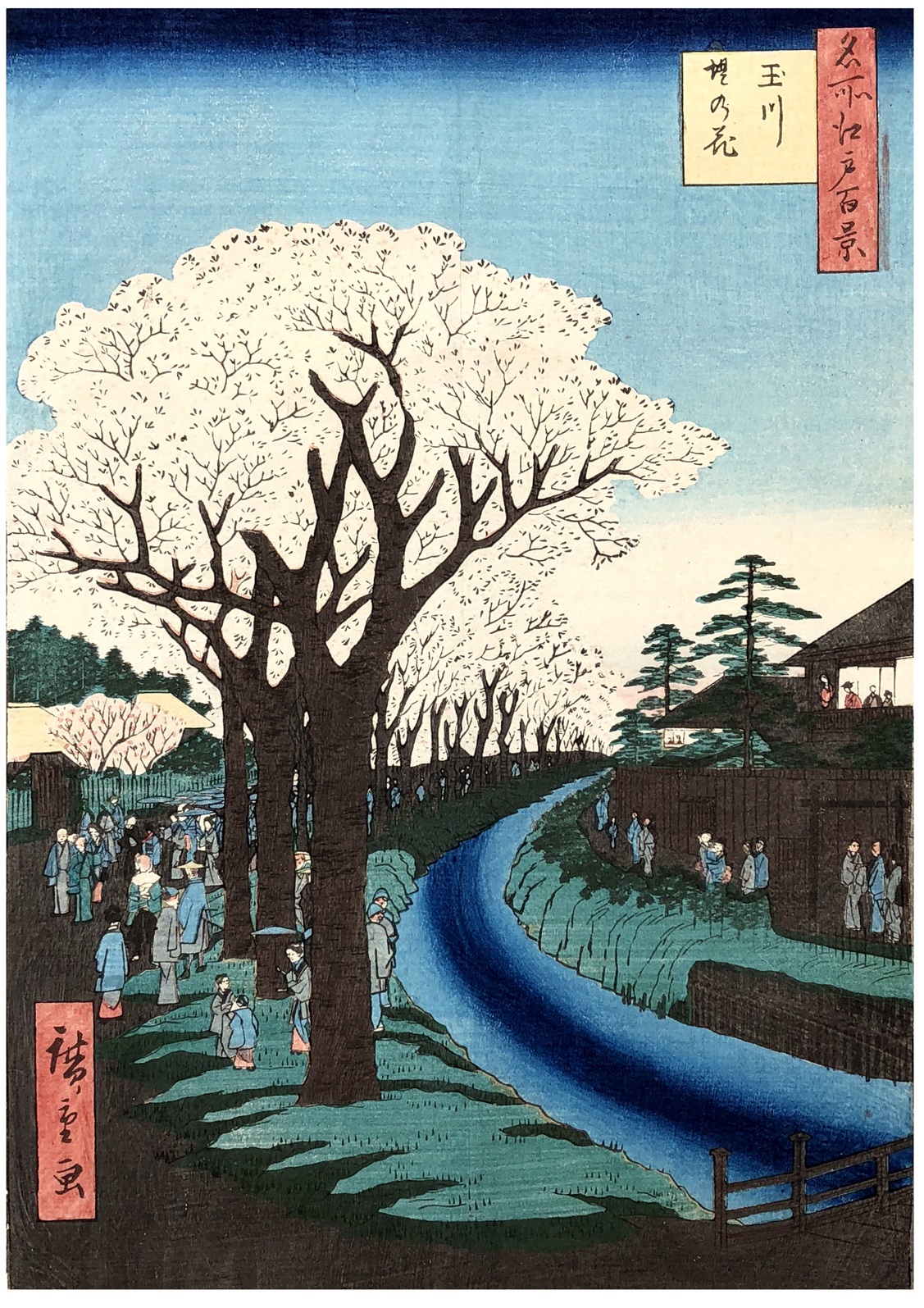 Notes: The "Tama River," actually the Tama River Aqueduct, carried much of the drinking water for the city of Edo along a thirty-mile course. Hiroshige's springtime view vividly conveys a freshness and vitality befitting this lifeline. The cherry trees were planted along much of the embankment in the 1730s. The placement was not only aesthetic but also practical: the trees' roots strengthened the banks, and their petals and leaves were thought to possess anti toxic powers that kept the water pure.