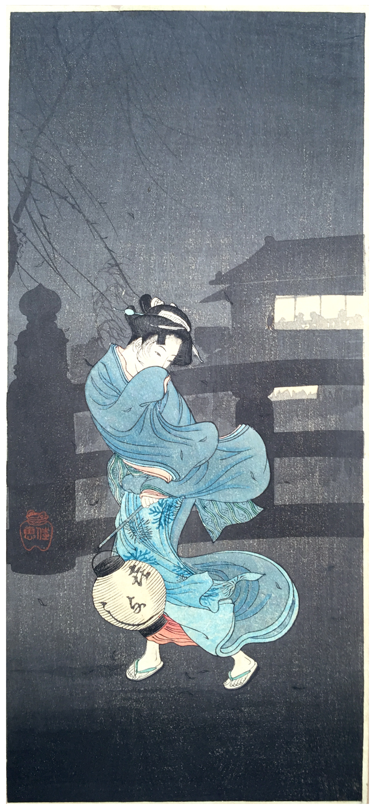 Notes: Shotei created 500 Works or so before the Kanto earthquake that destroyed all the blocks and inventory left. Later on, he re-carved about half of it. The most common version of this print is the 1936's reprint, where the red seal is rectangular and 2" lower in the print. See different version below :