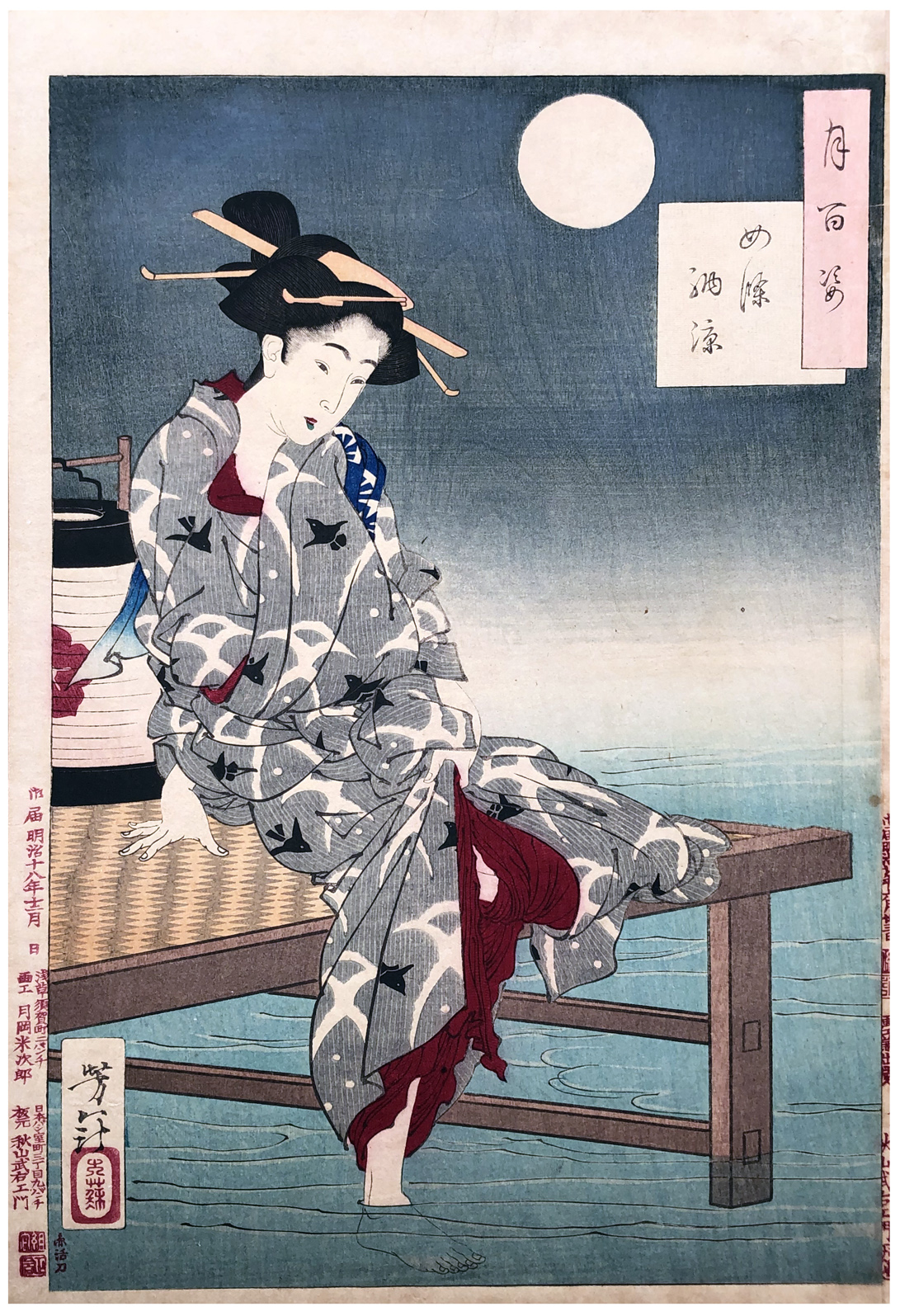 Woodblock Print Title: One Hundred Aspects of the Moon # 11 Cooling off at Shijo