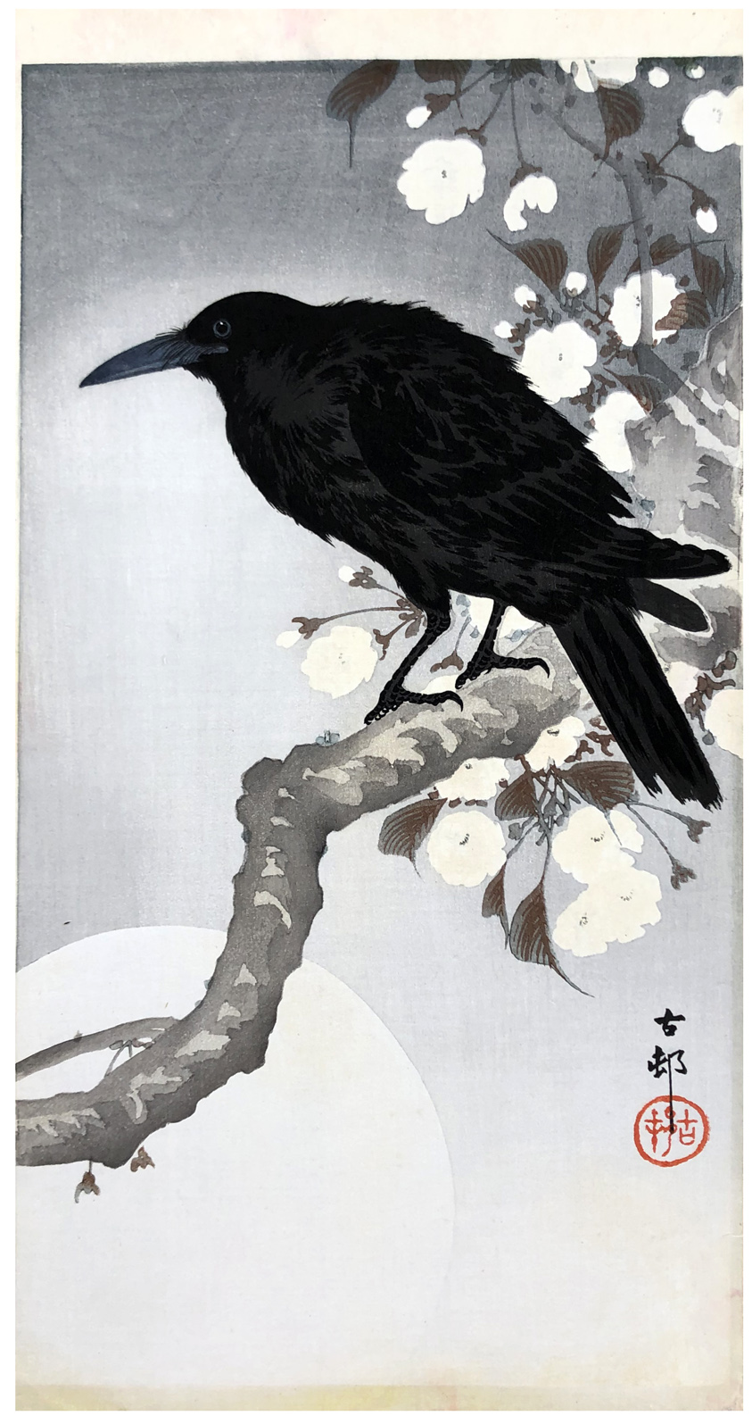 Woodblock Print Title: Crow on a Cherry Branch by Moonlight