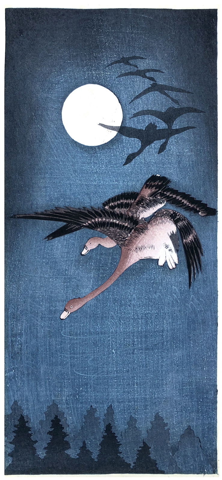 Woodblock Print Title: Descending Geese by Moonlight