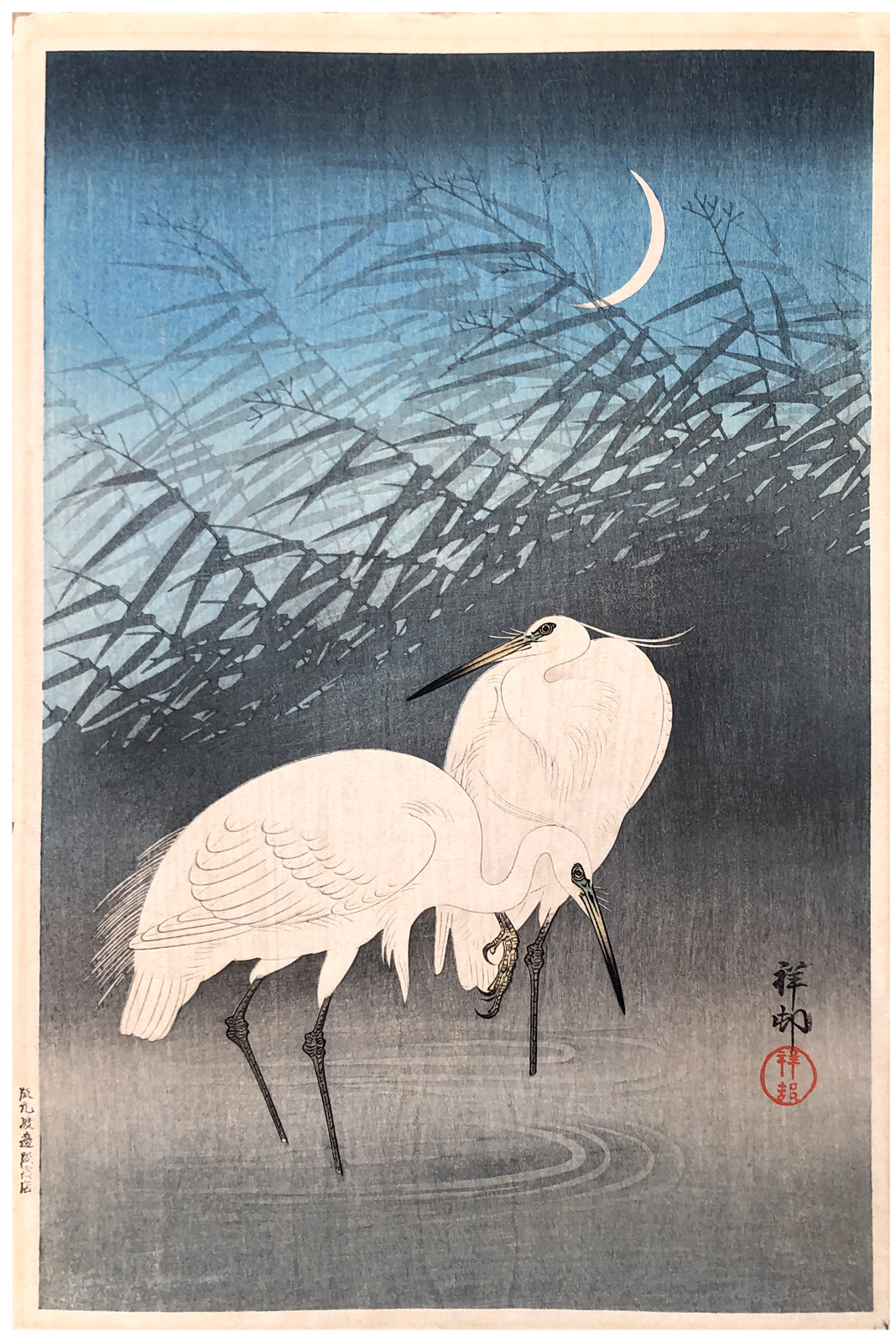 Woodblock Print Title: Egrets and Crescent Moon