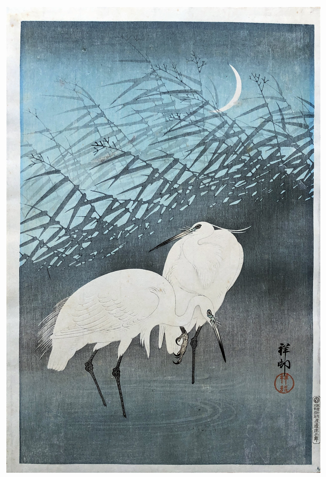 Woodblock Print Title: Egrets and Crescent Moon