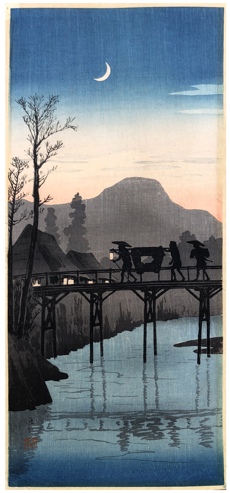 Woodblock Print Title: Evening Glow at Sakawa Bridge