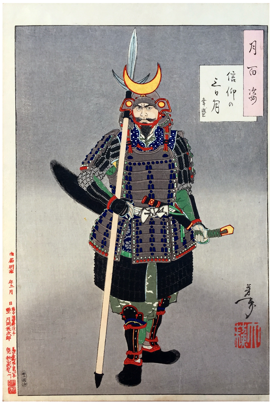 More about this print: Yamanaka Kikanosuke Yukimori (16th century) was one of the Ten Heroes of the Amako Clan in Isumo Province. Here he is shown in full armor, wearing a Hozoin halberd (print #95), and a helmet with the crescent (or third-day) moon. This is often considered to have been Yukimori's personal choice. However, the moon shaped maedate (figured plate) may also have been an intrinsic part of the Amako battle helmet, by which these warriors stood out in the field.