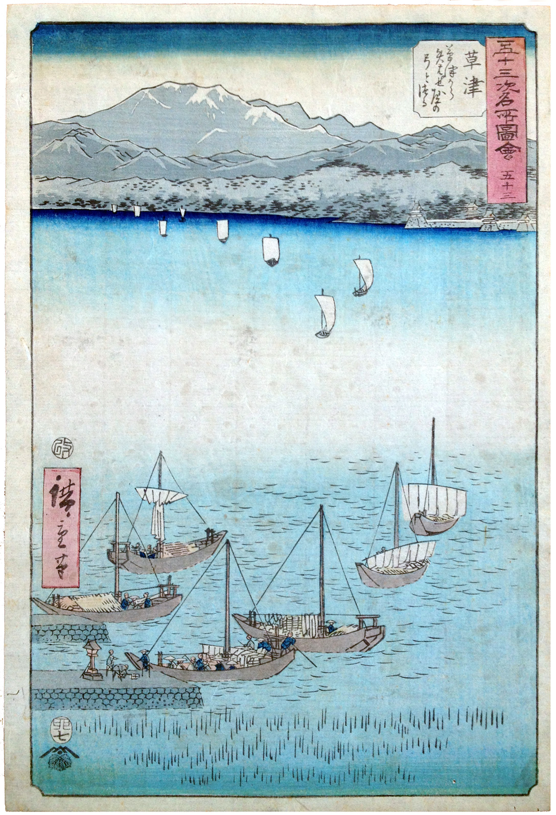 Title of the Print: 53 Stations of the Tokaido 'Tate-e' # 53: Sailing Boats at Yabase Ferry Gate on Kusatsu Beach, Kusatsu
