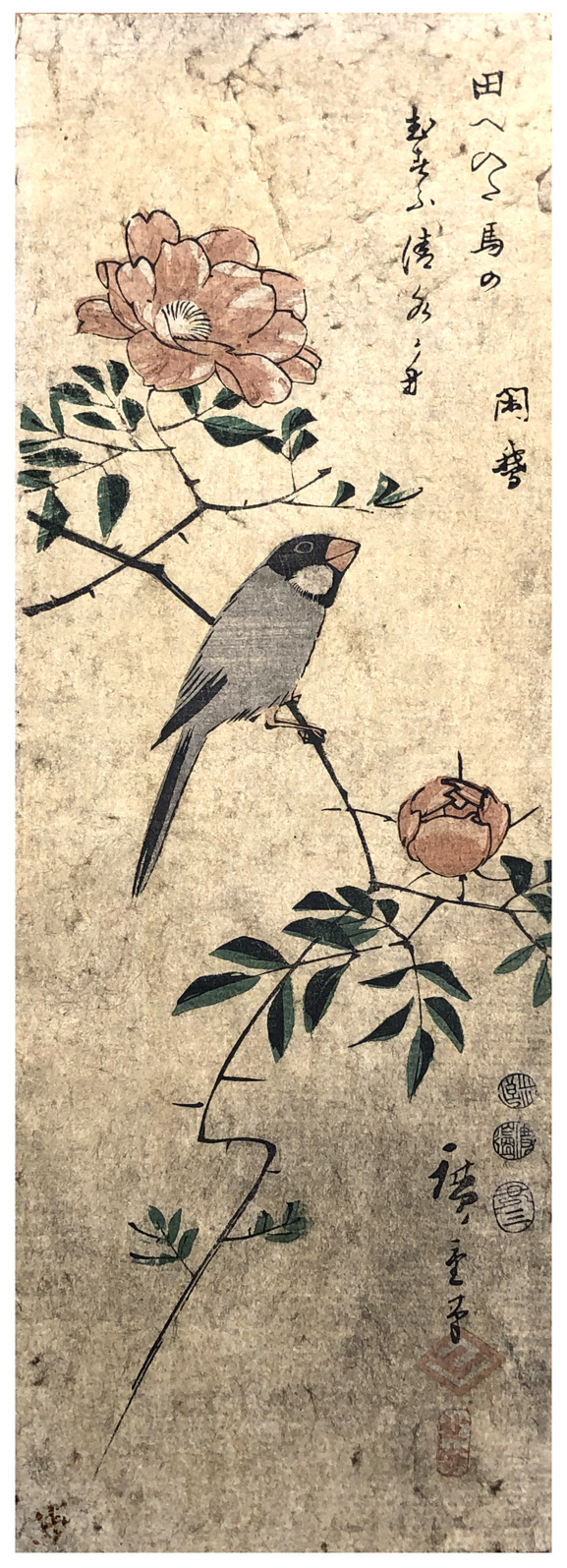 Woodblock Print Title: Finch on Camellia Branch