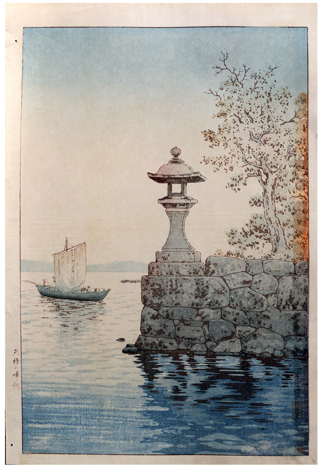 Woodblock Print Title: Fishing Boat Returning at Sunset Yabase