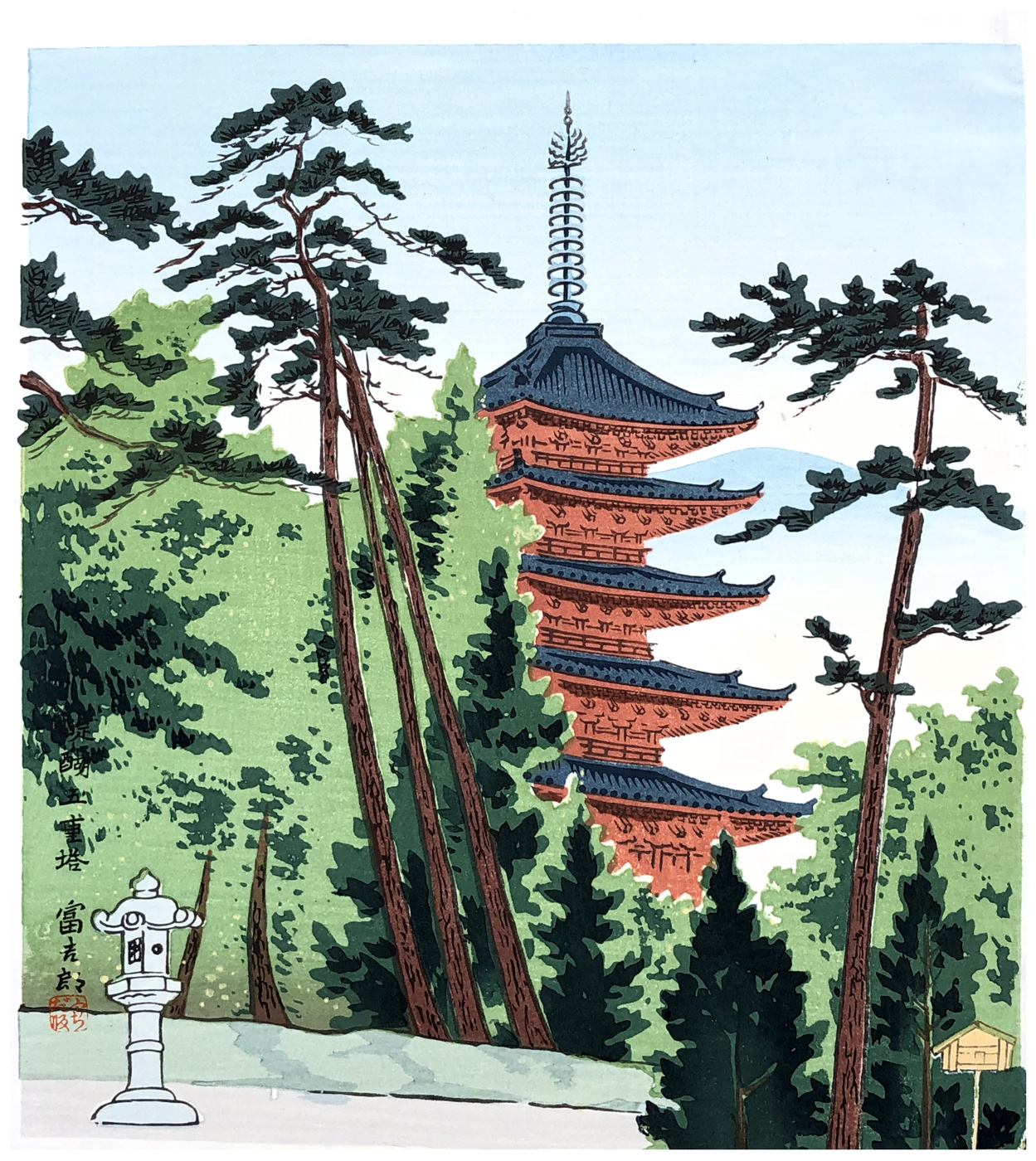 Woodblock Prints Title: Five Story Pagoda of Daigo, from the series, "Hanga Kyoraku Ju-go Kei" (Fifteen Views of Kyoto)
