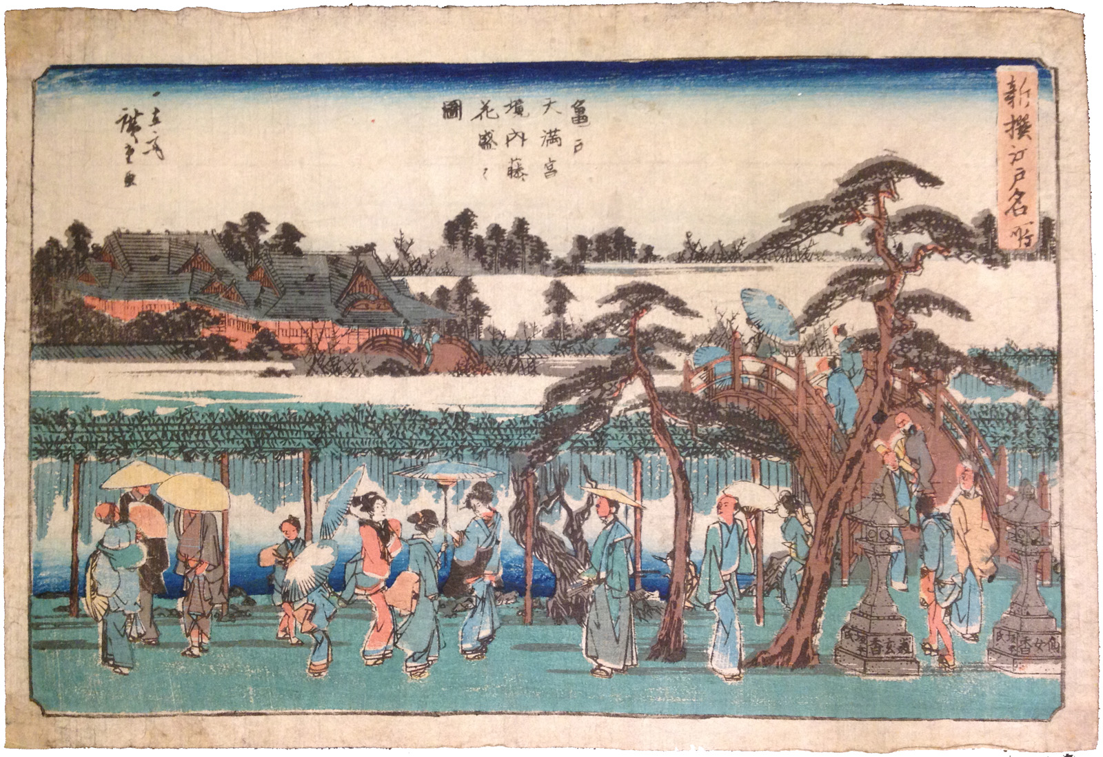 Title of the Print: Flowering Wisteria on the Grounds of Kameido Tenmangü Shrine from the series Famous Places in Edo