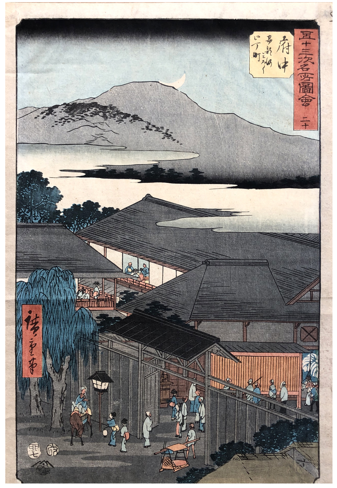 Woodblock Print Title: Fuchû: Miroku 2-Chôme, Abekawa (Fuchû, Abekawa Miroku nichôme), from the series Famous Sights of the Fifty-three Stations (Gojûsan tsugi meisho zue), also known as the Vertical Tôkaidô