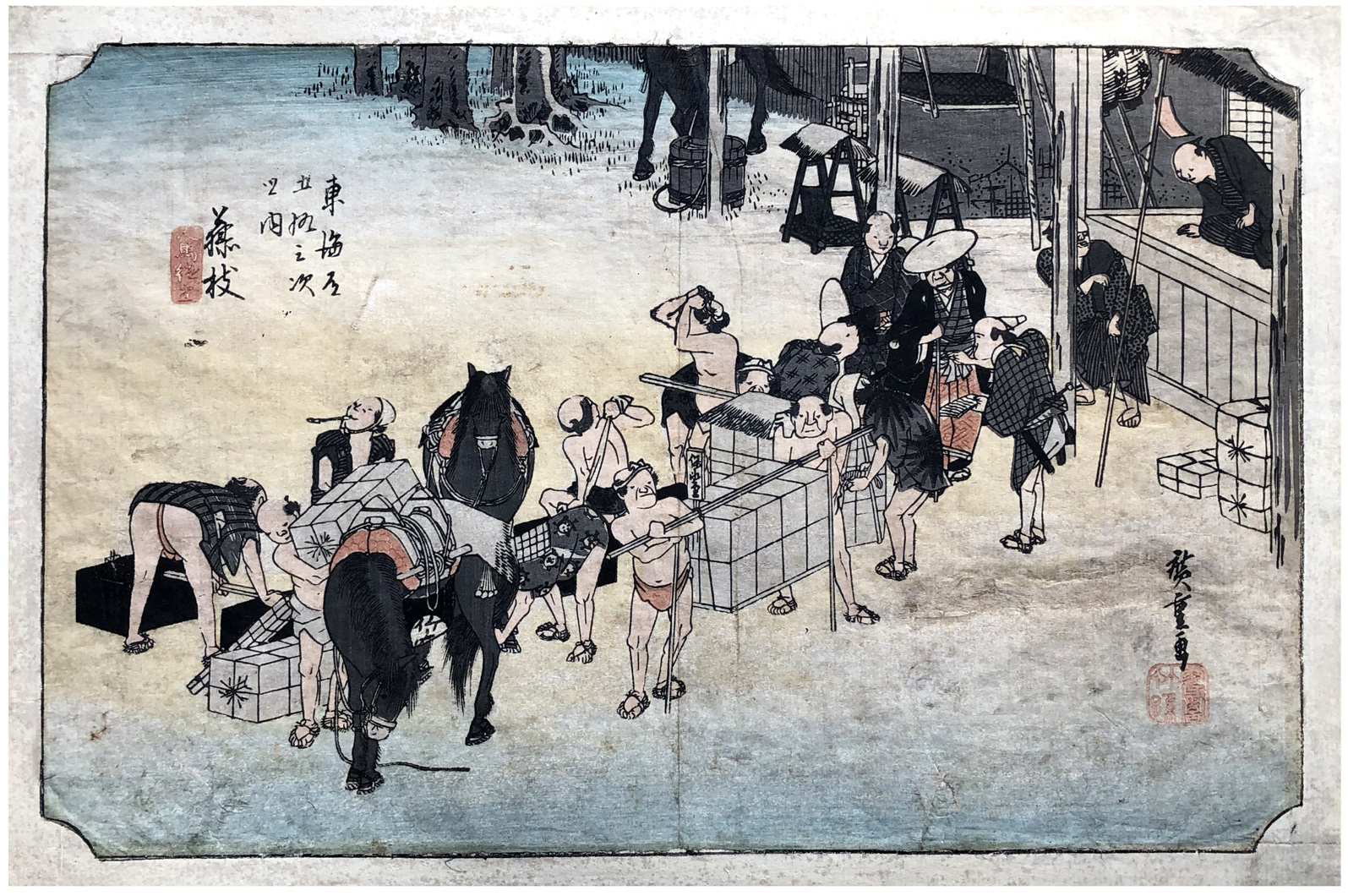 Woodblock Print Title: Fujieda: Changing Porters and Horses (Fujieda, jinba tsugitate), from the series Fifty-three Stations of the Tôkaidô (Tôkaidô gojûsan tsugi no uchi)