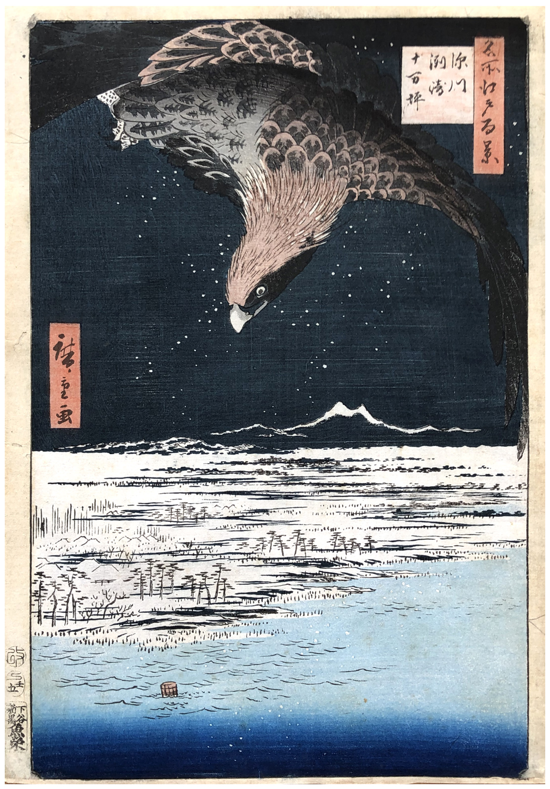 More about this print: This view looking northwest from Fukagawa Susaki, a spit of land along Edo Bay, toward Jūmantsubo, a tract of land named after its approximate area of one hundred thousand tsubo (about eighty acres), is one of the most dramatic designs of the series. Its appeal lies in the contrast between the powerful form of the eagle as it prepares to dive for prey and the desolate wintry marshes below. As in other views devoid of people, there is still a pervasive human presence—in the roofs huddled to the left, in the poles of the lumber-yards beyond, and, above all, in the lone wooden bucket floating at the edge of the bay, surrounded by water birds on which the eagle seems to have its eye.