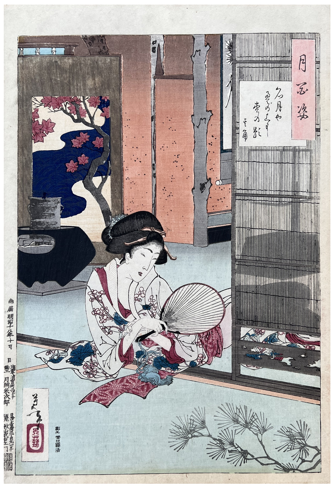 More about this print: This picture illustrates a verse by the celebrated haiku master Takarai Kikaku (1661-1707): "Bright moon - across the tatami mats shadows of pine branches" (printed October 1885). Stevenson* points out that, based on the hairstyle, the round uchiwa fan, and several other style elements, this design probably is a homage to Utamaro (1754-1806)