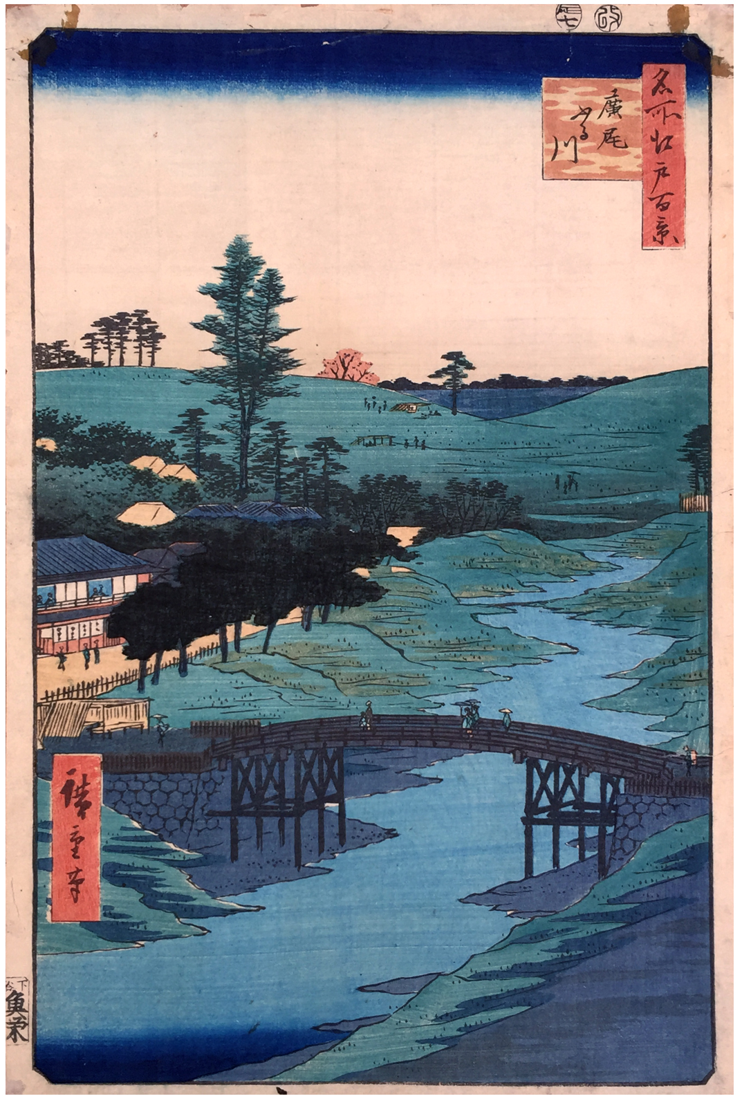 More about this print: For an Edo resident purchasing this print in 1856, the chief attraction of this scene of the Hiroo area of southwestern Edo may have been the half-hidden restaurant in the foreground to the left of the river. It was a famous eel restaurant named Owariya in a guide to Edo shops of 1811 and labeled "The Fox" on maps published after 1854. The restaurant had a widespread popularity at the time Hiroshige designed this print.