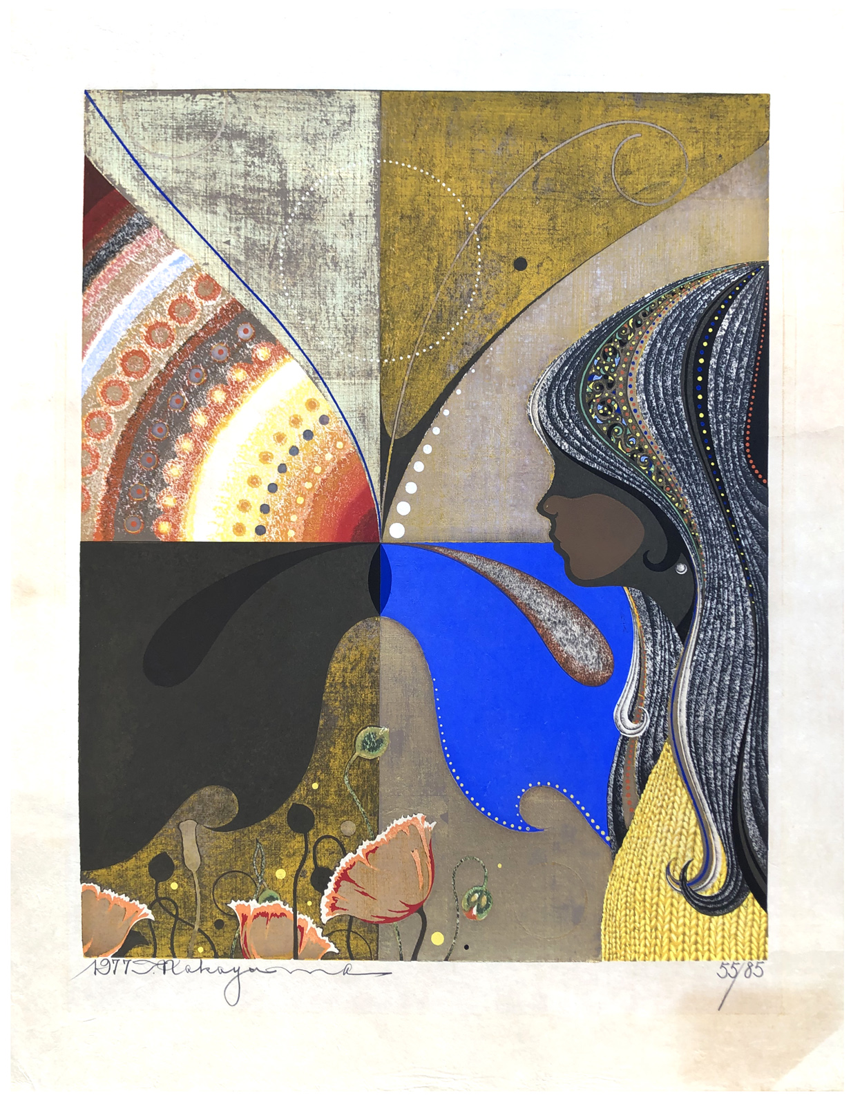 Woodblock Print Title: Butterfly, Girl and Flowers