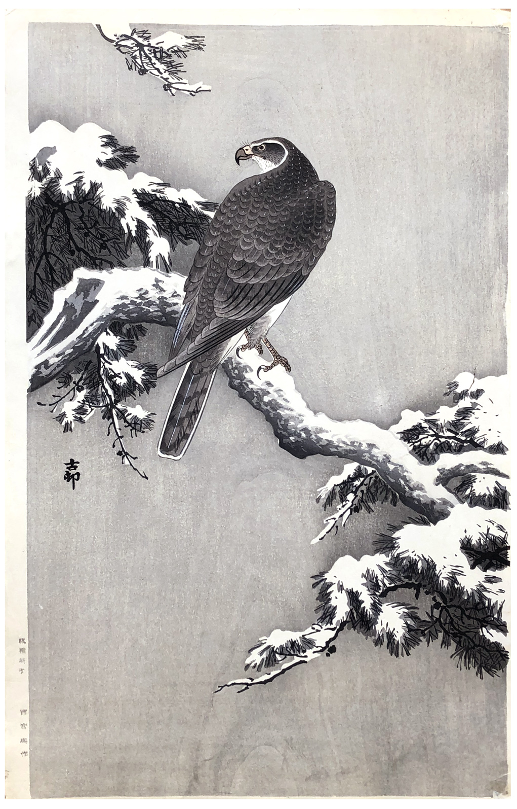 Woodblock Print Title: Goshawk on a Snow Covered Pine Branch