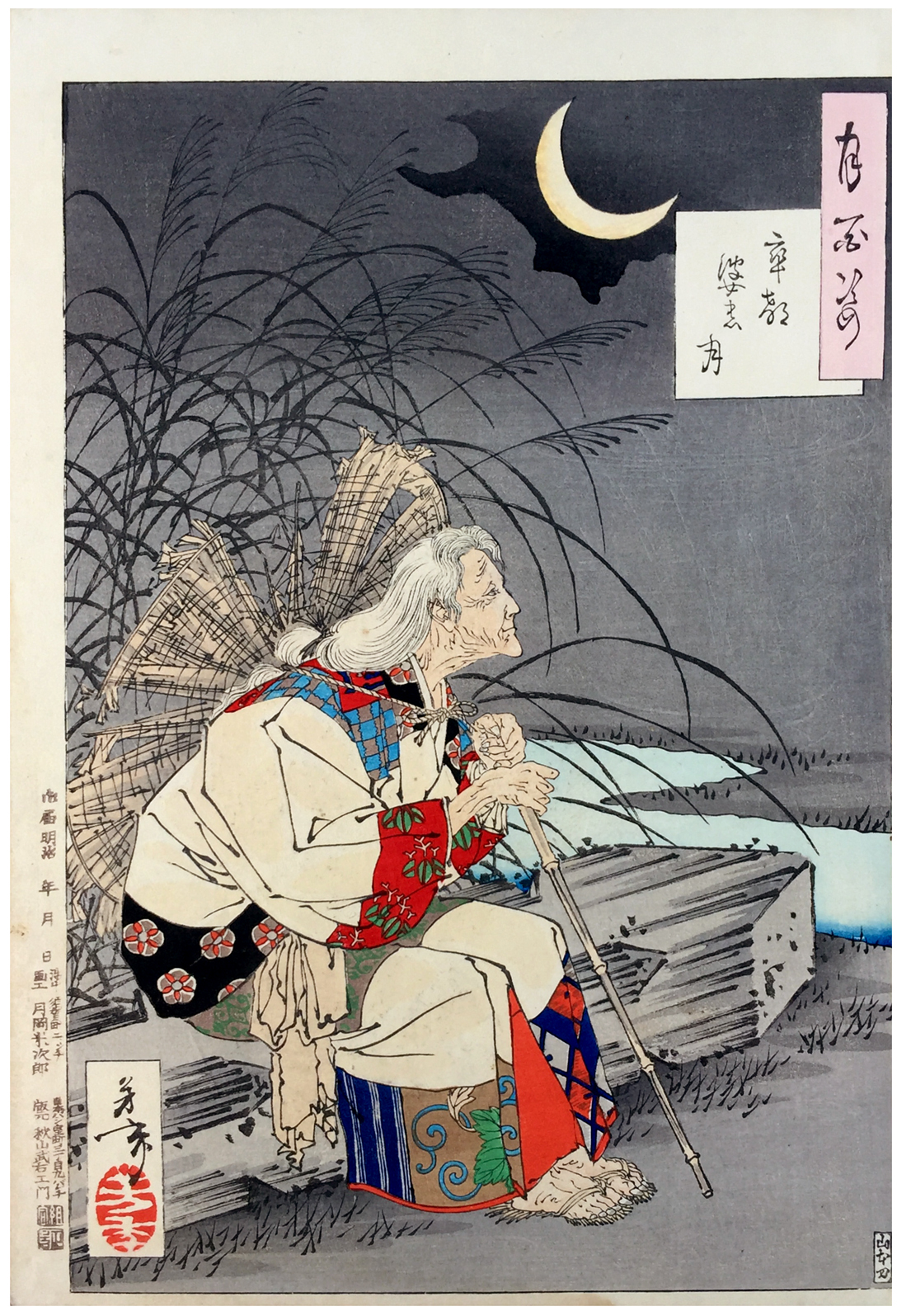 More about this print: Ono no Komachi, a famous beauty and poetess of the 9th century, is seated on a fallen stupa (a gravemarker dedicated to Buddha). This may be the scene from the Noh play Sotoba Komachi (Stupa Komachi) in which two priests ask themselves: "Is this Komachi that once was a bright flower - Komachi the beautiful, whose dark brows linked like young moons - Her face white-farded ever - Whose many, many damask robes filled cedar-scented halls?"
