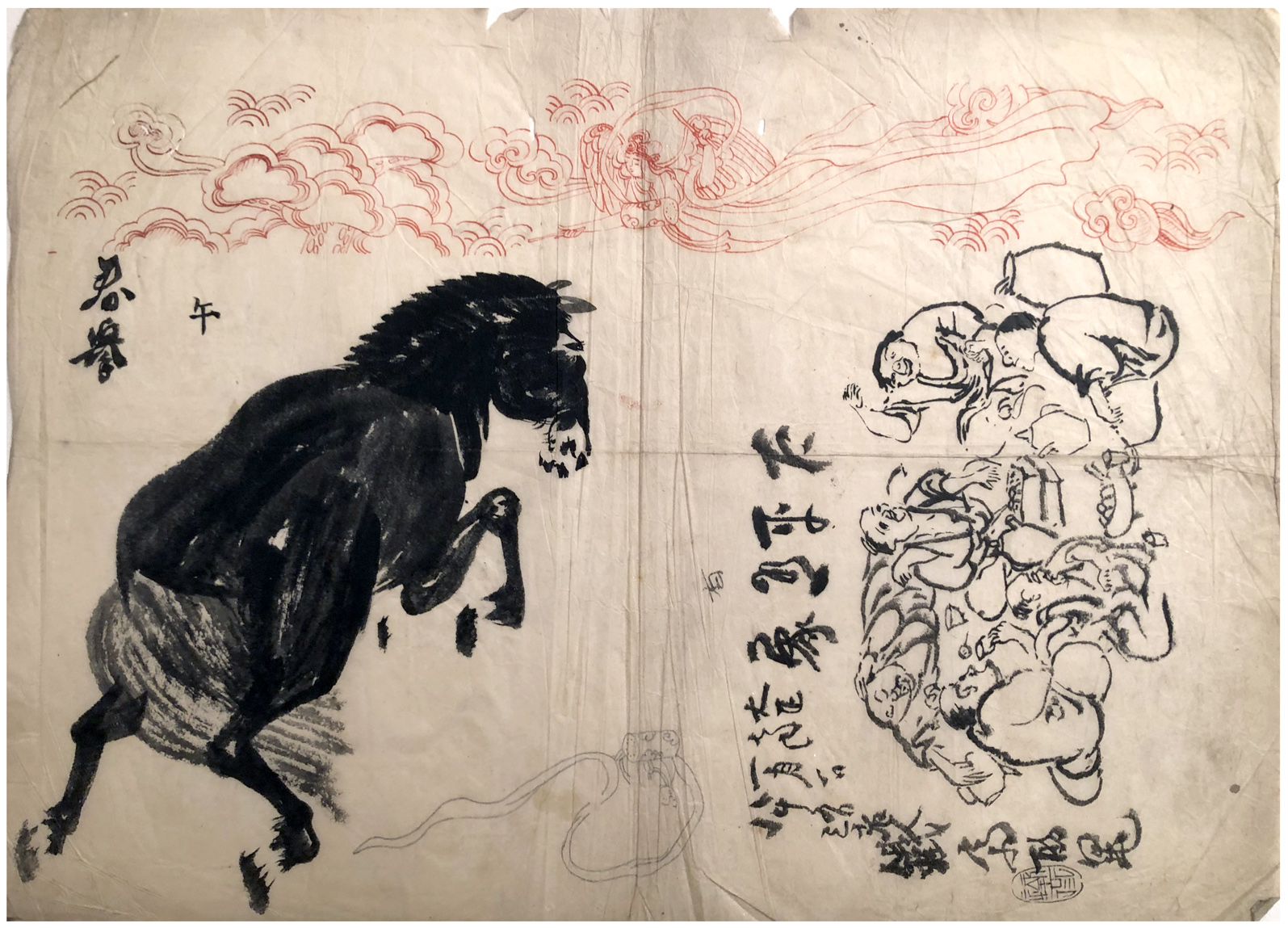 Woodblock Print Title: Hand Drawing - Preparatory Drawing representing a horse, a group of old men, an Angel in the sky