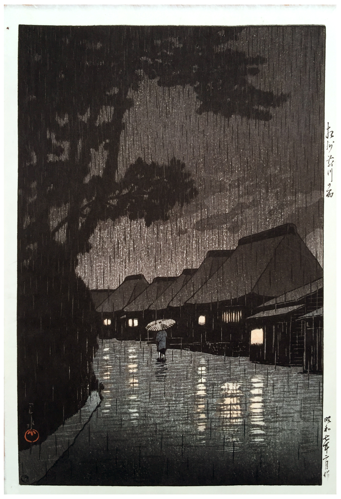 Notes: Splendid, beautiful rain print from Kawase Hasui, bearing the RED 6mm Seal from Wanatabe. This print is absolutely sumptuous, in pristine condition, with very bright colors.