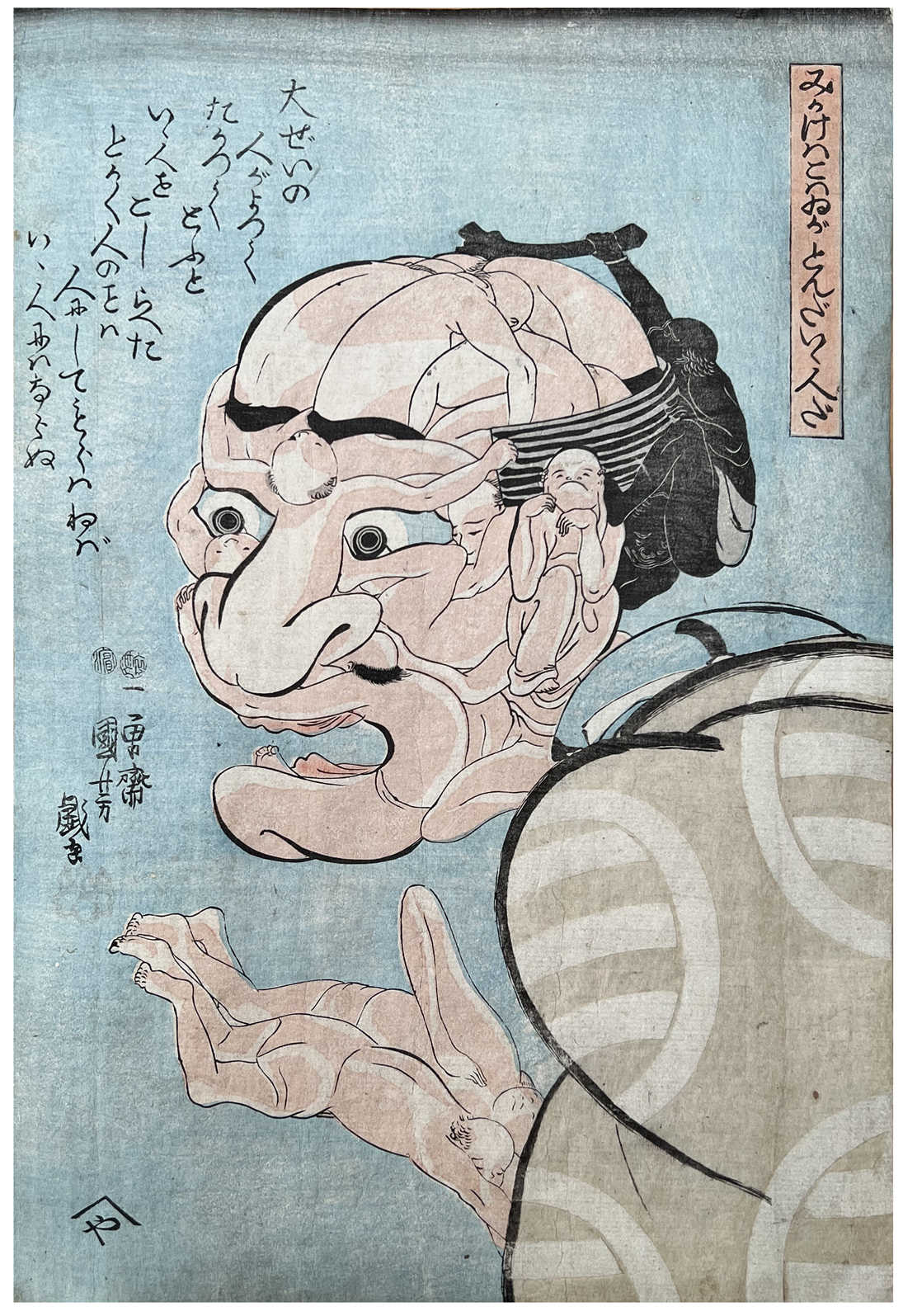 Woodblock Print Title: At first glance he looks fierce, but he is really a kind person (Mikake wa koi-i tonda iku hitoda, みかけはこわいがとんだいい人だ)