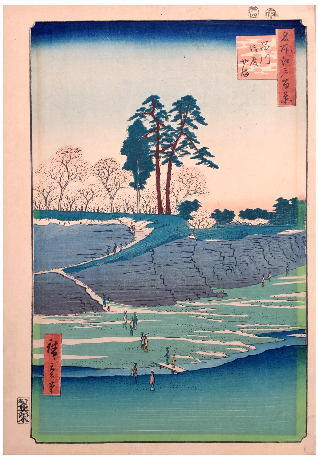 More about this print: Gotenyama, or Palace Hill, was the southernmost projection of the Shinagawa heights. It overlooked the Meguro River to the south and the Tokaido highway to the east as the road passed through the narrow settlement of Shinagawa, gateway to the city of Edo.