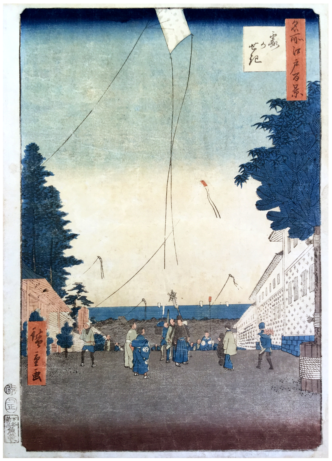 At the center is a somber procession of street theater performers climbing the slope known as Kasumigaseki. Two manzai artists, who perform celebratory chants and dances for samurai families, observe them. Kites fly above; one is inscribed with the name of the publisher of the series, which translates as "fishmonger."