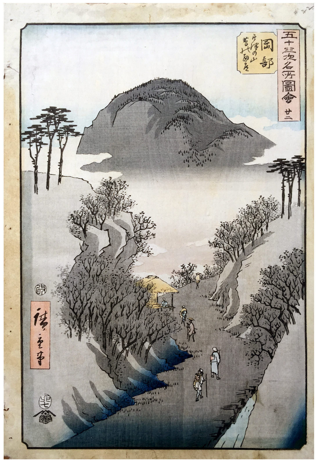Woodblock Prints Title: No. 22, Okabe: The Narrow Ivy-Covered Road at Mt. Utsu (Okabe, Utsu no yama tsuta no hosomichi), from the series Famous Sights of the Fifty-three Stations (Gojûsan tsugi meisho zue), also known as the Vertical Tôkaidô
