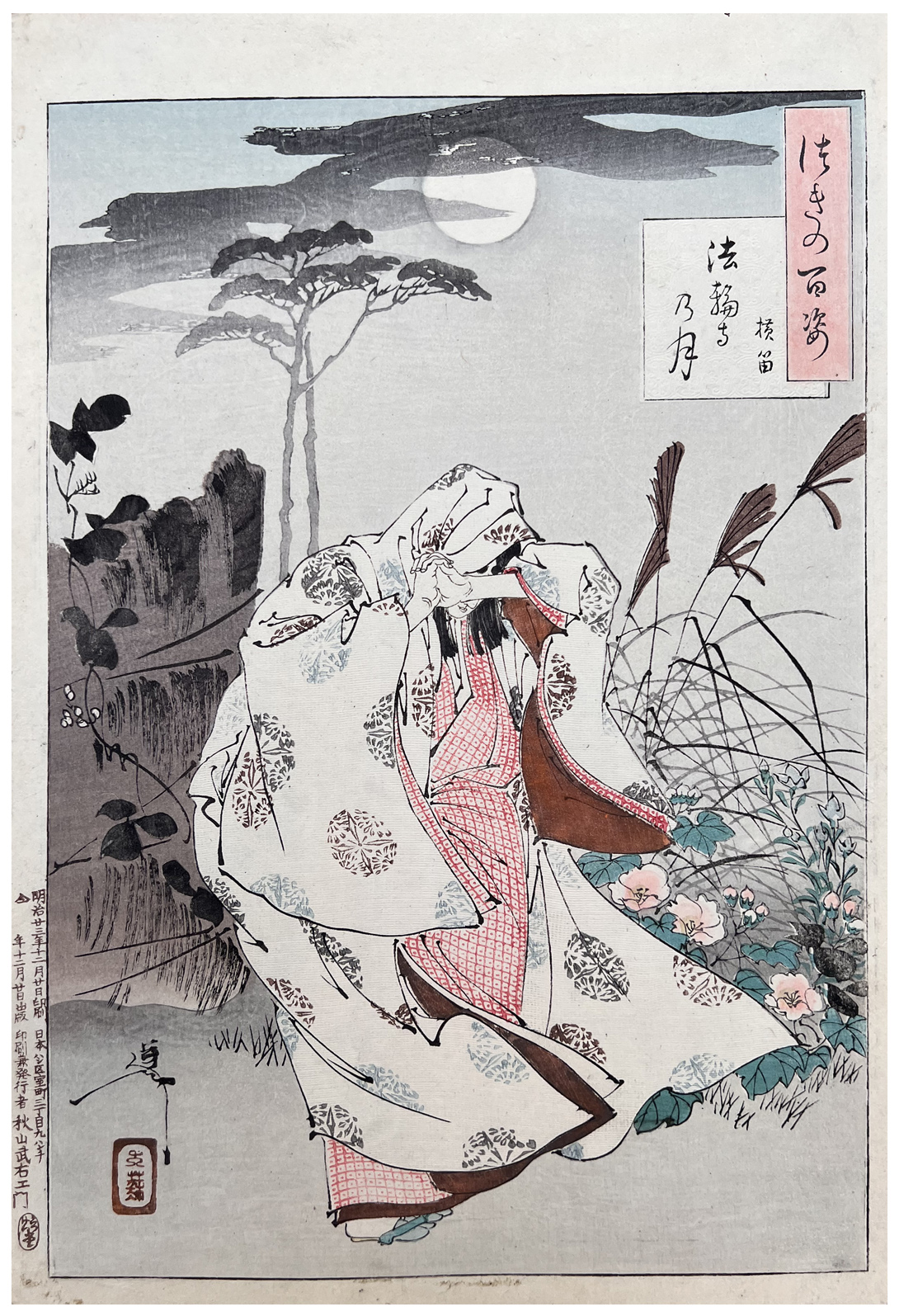 More about this print: The weeping woman is Yokobue, a lady-in-waiting to the Empress Kenreimonin (1155-1213). She fell in love with palace guard Tokiyori who, when his father disapproved, took religious orders. She followed him to the Horin temple in Saga near Kyoto to ask him to return, but he refused to see her.