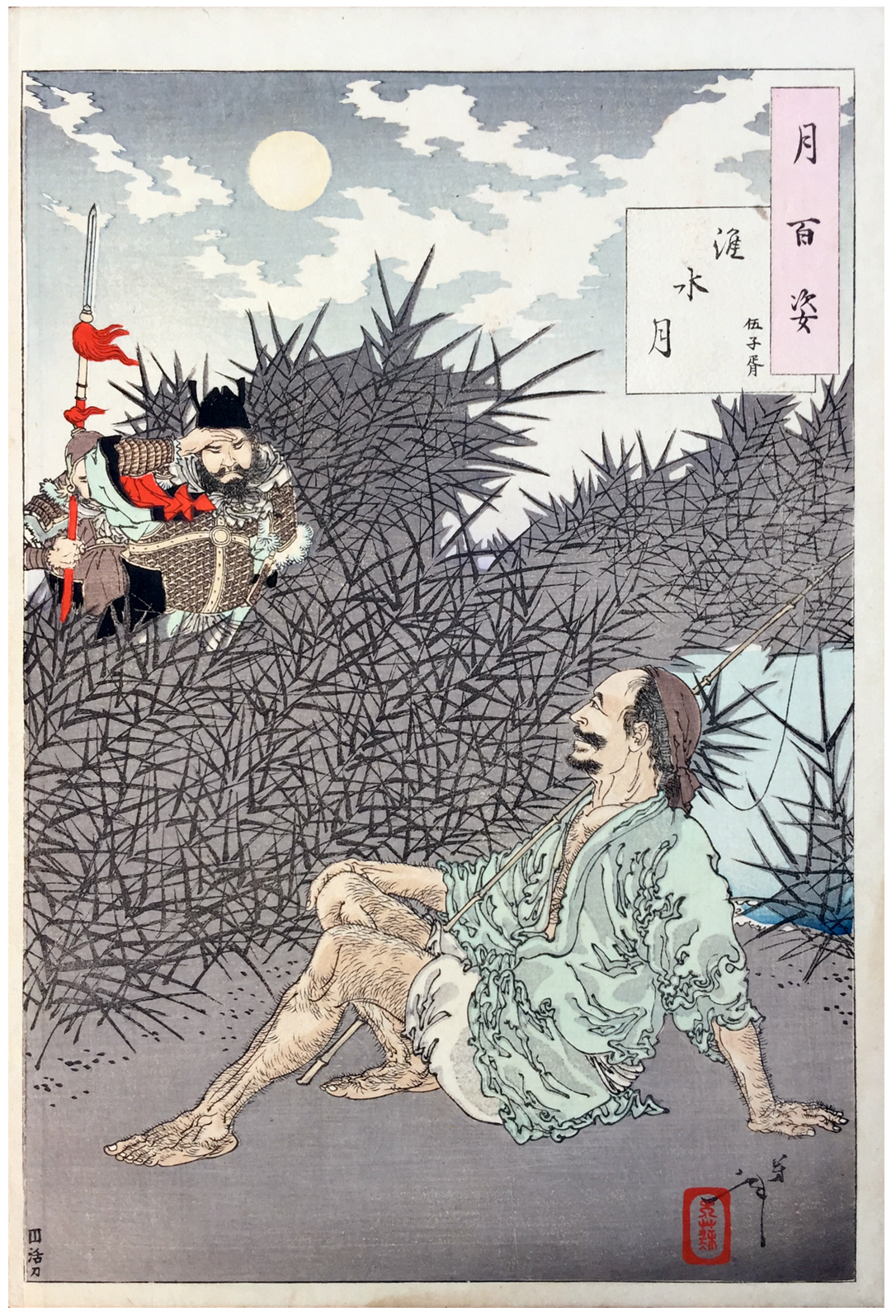 More about this print: Most reviewers take for granted that name in the title refers to the story of the Chinese general Wu Zixu (cir. 490 BC), who wanted to avenge his father's death, and was aided by a Huai River fisherman in locating the grave of the murderer. Perhaps the prominence of the grinning fisherman in this design demands a better explanation. Stevenson* suggest a different story - that of the wise fisherman Jiang Ziya, who became a counsellor for emperor Shi Bei - but this does of course not explain the title.