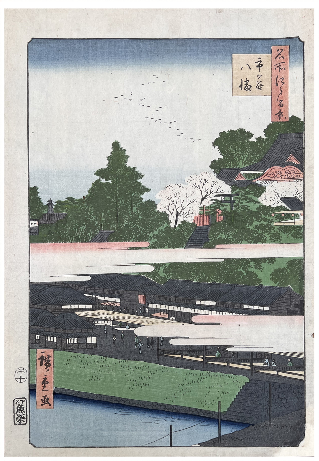 lchigaya Hachiman was located at the western edge of a long bluff that in the Edo period was one of the estates of the Tokugawa family of Owari (Nagoya), and a watchtower and part of the outer barrack walls of the Owari mansion can be seen at the upper left. It was there that the novelist Mishima Yukio performed his dramatic ritual suicide in 1970.