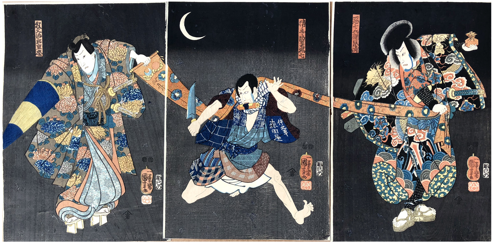 Woodblock Prints Title: Actors Kataoka Gadô II as Chichibujirô Shigetada, Ichikawa Ebizô V as Bôzukibashichi, and Ichikawa Danjûrô VIII as Aku Shichibee Kagekiyo