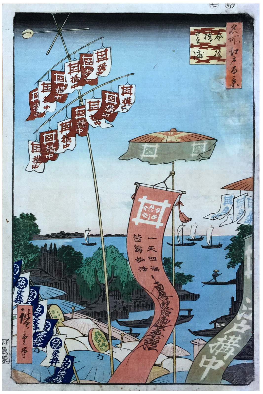 More about this print: This colorful procession is a group of Nichiren Buddhists crossing the Kanasugi Bridge along the stretch of coast known as Shibaura. The autumn season assigned to the print suggests that it is Oeshiki, the thirteenth day of the Tenth Month, the day Nichiren, the founder of this particular Buddhist sect, died in 1282.