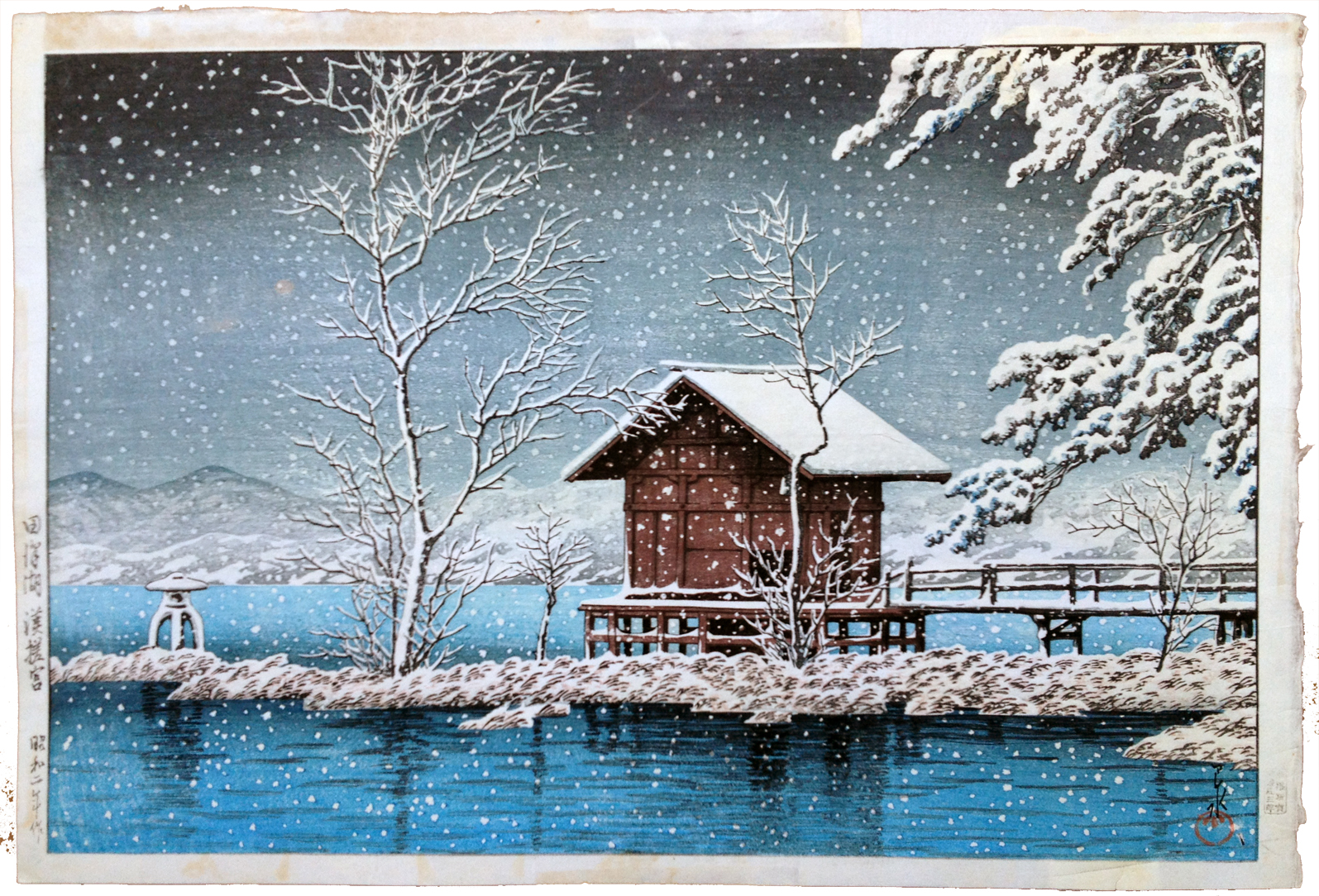 Notes: Extremely rare 1st edition of this beautiful snow scene print, bearing a slightly faded "A" seal. Hasui was known for his beautiful landscape print, this snow scene is one of his best realization.