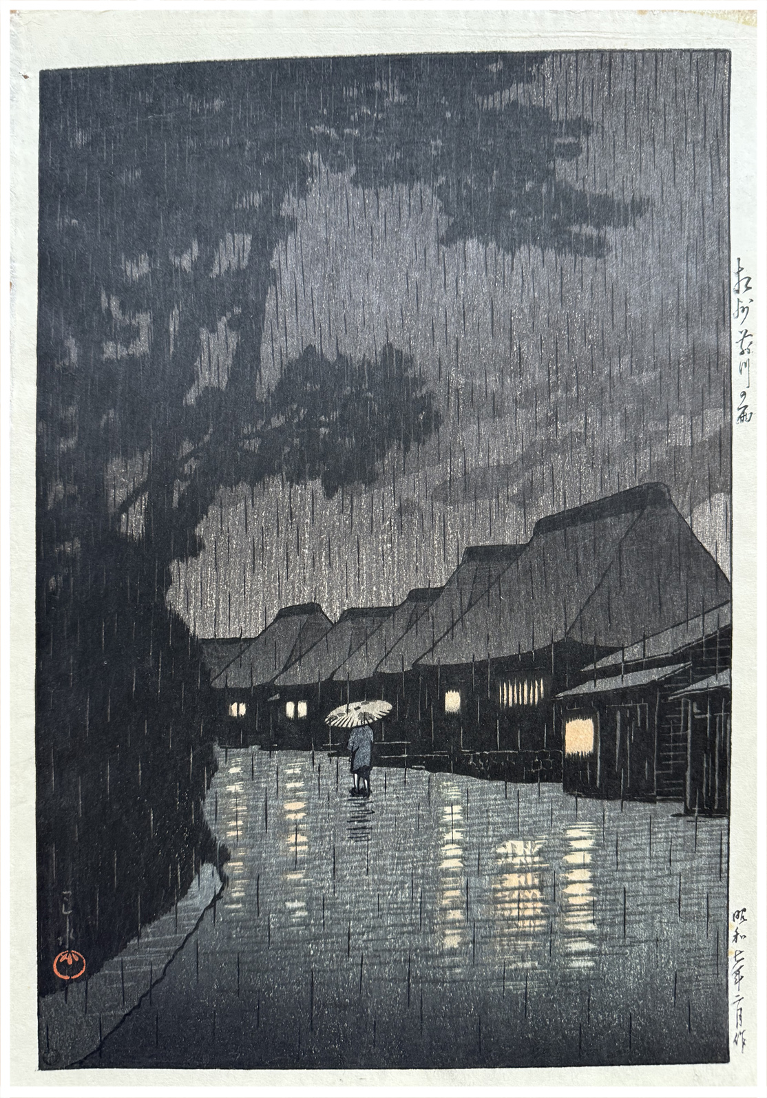 Woodblock Print Title: Rain at Maekawa
