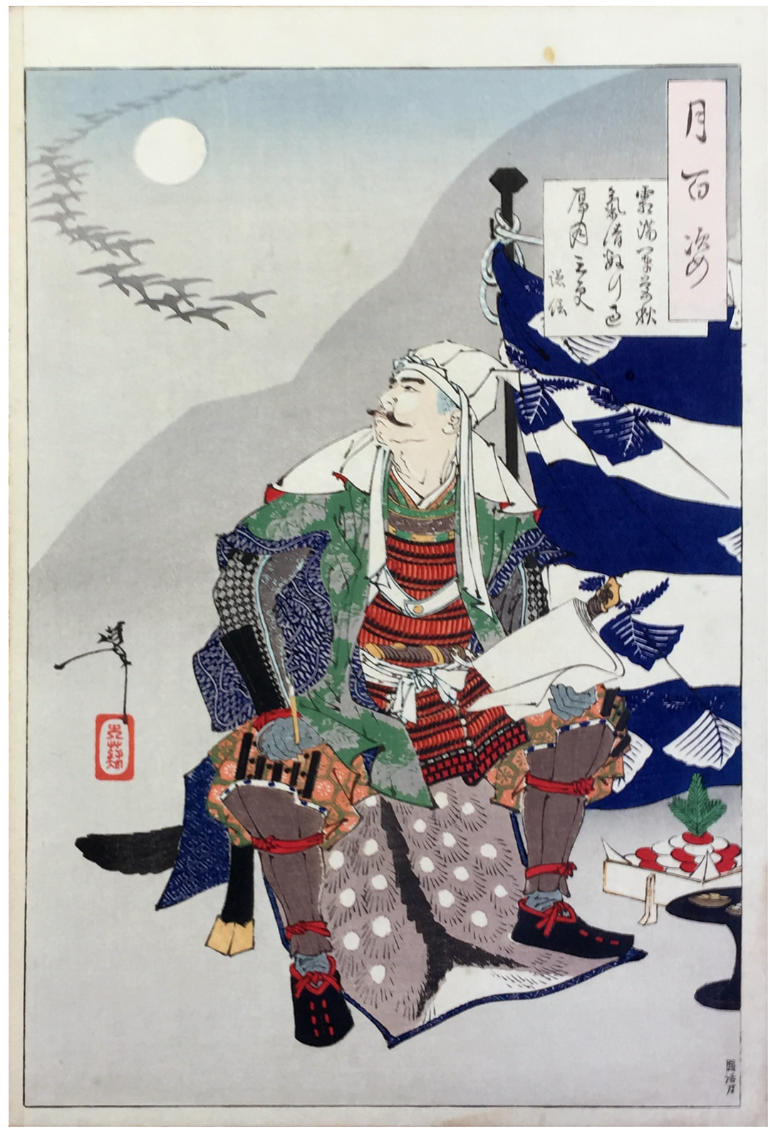 More about this print: Uesugi Terutoa (1530—1578), also known by his Buddhist priest name Kenshin, was famed for his military expertise and strategy, and for the legendary rivalry with Takeda Shingen (print #41). Here he is seen on the eve of a successful battle on the island of Sado, watching a flight of birds pass the midnight full moon, and moved to compose a poem that reads: "Frost fills the camp and the autumn air is still - lines of returning geese cross the moon of the third hour."