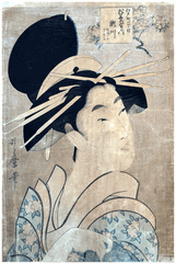 Condition: A couple of clear spots, one in the upper corner, the other one by the wrist. Color fading due to age, consistent with Utamaro Original designs. Overall toning, leaving some white, untonned type of marks throughout the print. Good overall condition.