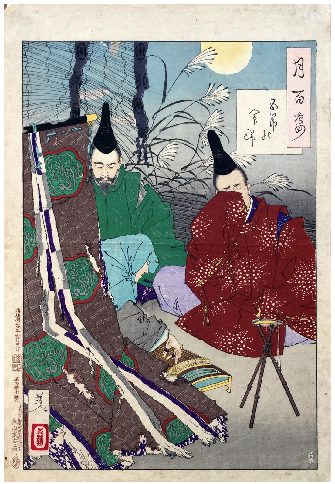 More about this print: Several elements in this design point at gone-by wealth, notably the torn tapestry, and the battered blinds. The woman playing the koto is dressed as a nun. Her two visitors wear Heian court costumes. They are moved, either by her music, or the state they find her in, or perhaps both.