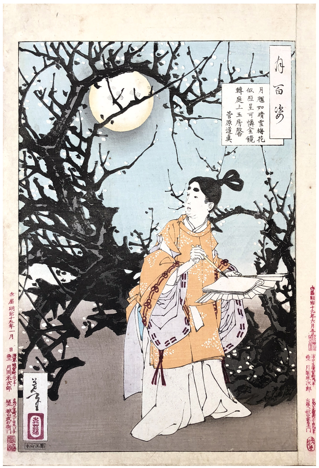 More about this print: Sugawara no Michizane (845-903 AD) was a courtier who was posthumously deified as Tenjin, the god of music, literature, and calligraphy. At age eleven, he composed the following poem in classical Chinese form: “The moon glimmers like bright snow, and plum blossoms appear like reflected stars - Ah! The golden mirror of the moon passes overhead as fragrance from the jade chamber fills the garden.”